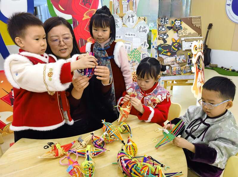 1月13日,青岛市崂山金融区实验幼儿园,小朋友们在跟志愿者老师学习非遗竹编的制作。李庚伟/摄