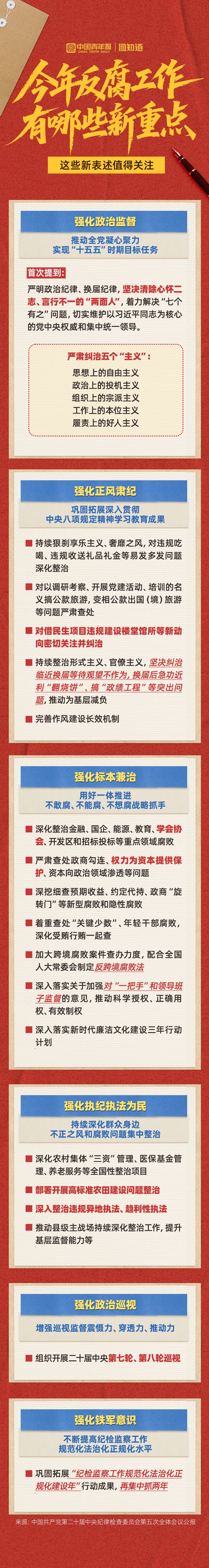 1月14日,中国共产党第二十届中央纪律检查委员会第五次全体会议公报发布。公报从六大方面部署了2026年任务,其中不乏新重点、新表述。在强化政治监督中,纠治五个“主义”,清除心怀二志、言行不一的“两面人”都是首次提到。在深入整治腐败的重点领域的表述上也发生了变化,新增“学会协会”。严肃查处“权力为资本提供保护”,“深入整治违规异地执法、趋利性执法”等,也是新提法。此外,公报还提到,将组织开展二十届中央第七轮、第八轮巡视。公报中还有哪些反腐领域新重点,一图了解⬇️