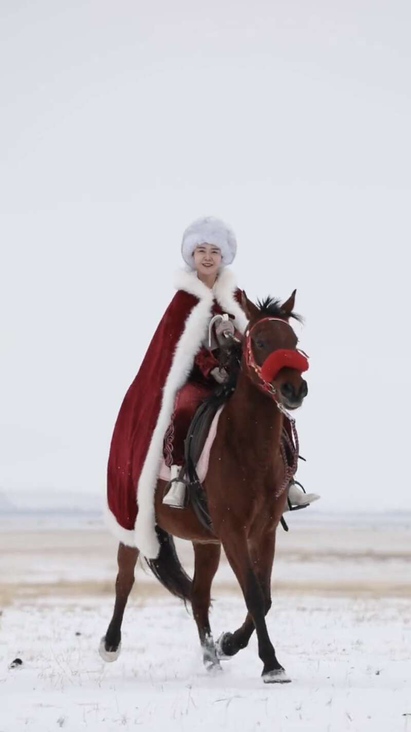 2026年元旦该账号发布的第一条视频,画面中依然是在皑皑白雪中骑马奔驰的贺娇龙,视频配文:保持马不停蹄的干劲,一起为梦想奋斗、为幸福打拼。