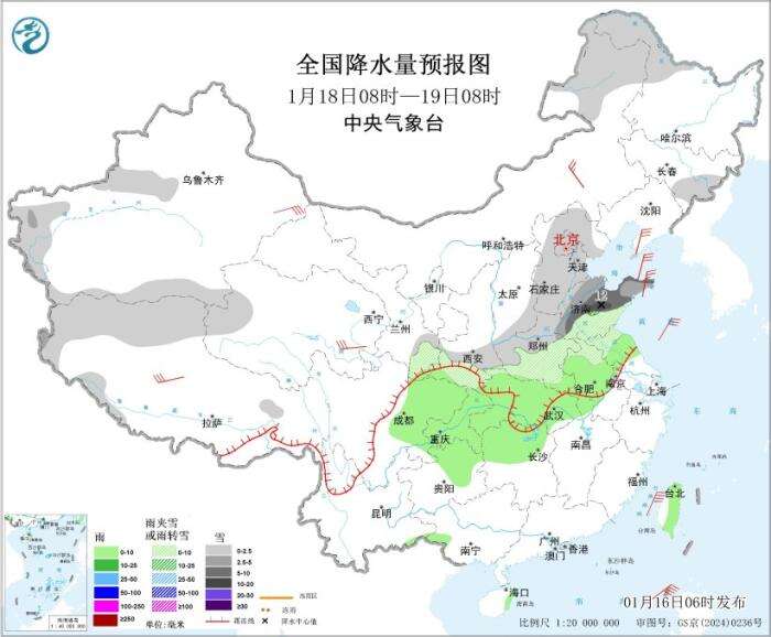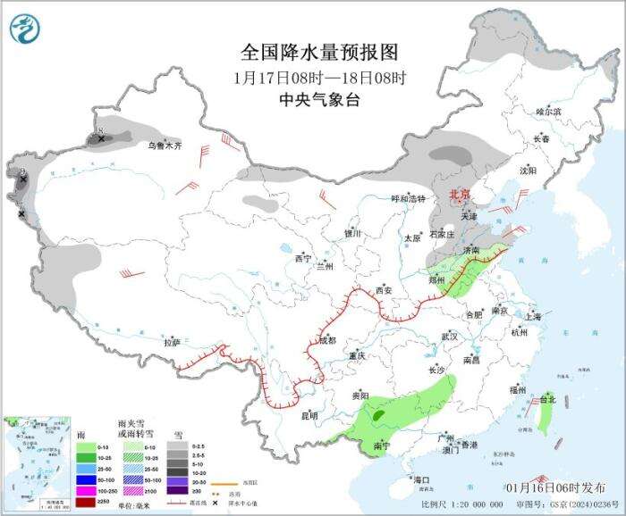 1月17日08时至18日08时,新疆沿天山地区和南疆西部山区、内蒙古中部、华北东部、黄淮北部、黑龙江北部、西藏西部等地部分地区有小到中雪或雨夹雪,其中,新疆伊犁河谷和南疆西部山区等地部分地区有大雪(5~9毫米);山东南部、河南东部、安徽北部、湖南南部、广西北部和西部、台湾岛东部等地有小雨。新疆东部、内蒙古中西部、辽东半岛、山东半岛、西藏中西部等地部分地区有5~7级风;台湾海峡、南海东北部有5~7级风、阵风8级(见图2)。