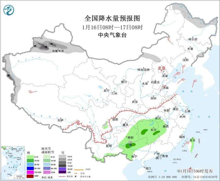 1月16日08时至17日08时,新疆沿天山地区及南疆西部山区,黑龙江北部、吉林东部、西藏西部等地部分地区有小到中雪,其中,新疆沿天山西部地区和伊犁河谷等地部分地区有大到暴雪(10~16毫米);江南中西部、贵州东部和南部、广西西部和北部、云南南部、台湾岛东部等地部分地区有小到中雨,广西西北部局地有大雨(25~30毫米)。内蒙古中东部、华北北部、黄淮中东部、辽宁南部、西藏中西部等地部分地区有4~6级风;渤海、渤海海峡、黄海北部和中部有5~7级风、阵风8级(见图1)。