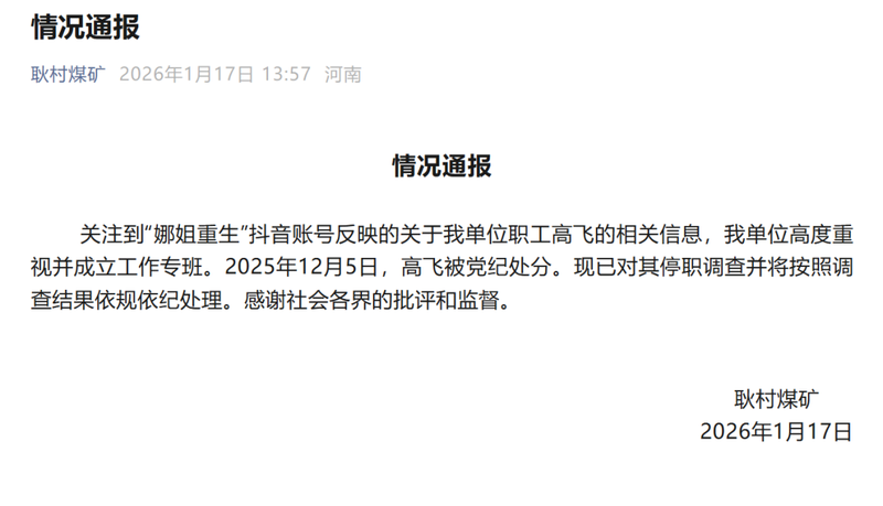 关注到“娜姐重生”抖音账号反映的关于我单位职工高飞的相关信息,我单位高度重视并成立工作专班。2025年12月5日,高飞被党纪处分。现已对其停职调查并将按照调查结果依规依纪处理。感谢社会各界的批评和监督。