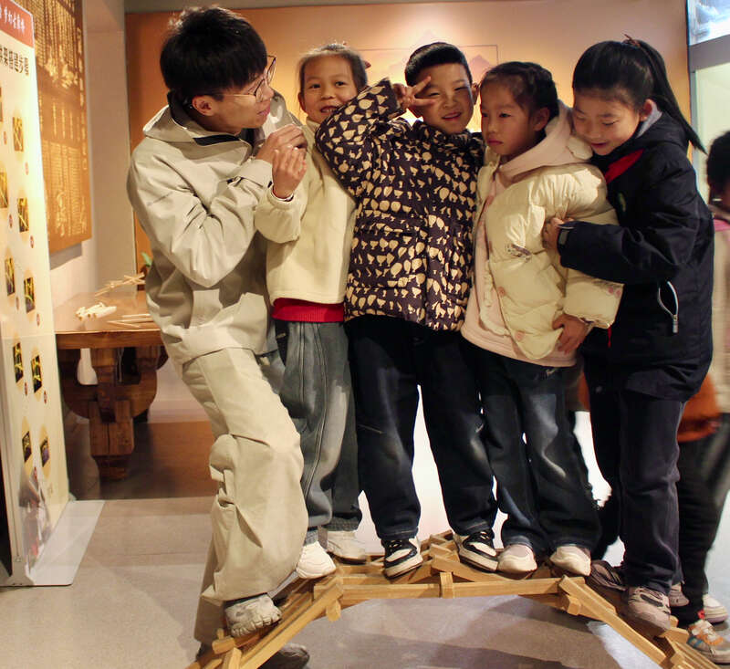 在浙南闽北的群山之间,百余座廊桥横跨溪流,承载着宋、元、明、清朝代的建筑智慧。庆元县胡淼技能大师工作室的青年志愿者胡俊峰,带领中小学生化身为“小小建筑师”“护桥志愿者”,在一榫一卯、一梁一柱间,探寻廊桥文化传承技艺。
