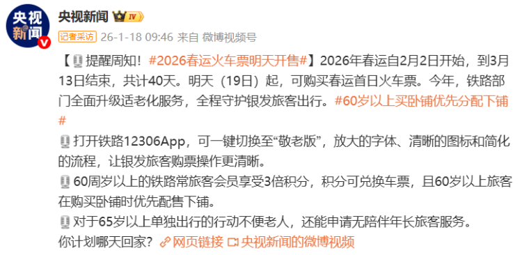 2026年春运自2月2日开始,到3月13日结束,共计40天。明天(19日)起,可购买春运首日火车票。今年,铁路部门全面升级适老化服务,全程守护银发旅客出行。