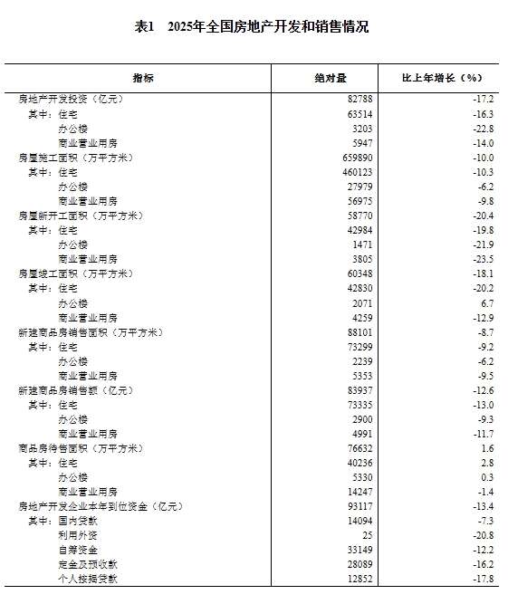 2025年,新建商品房销售面积88101万平方米,比上年下降8.7%;其中住宅销售面积下降9.2%。新建商品房销售额83937亿元,下降12.6%;其中住宅销售额下降13.0%。