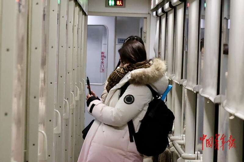 1月19日,黑龙江哈尔滨站,一位旅客登上列车后,为同行旅客拍照留念。中青报·中青网记者 杨雷/摄