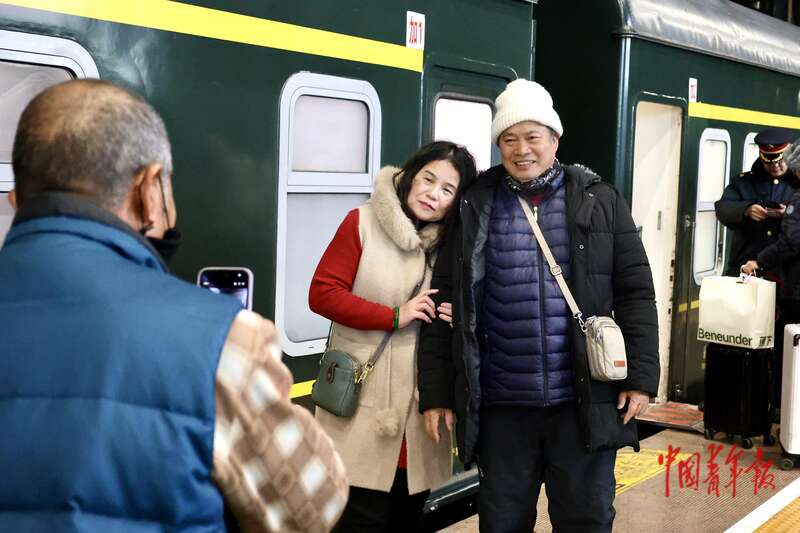 1月19日,黑龙江哈尔滨站,上车前,两位旅客在站台合影。中青报·中青网记者 杨雷/摄