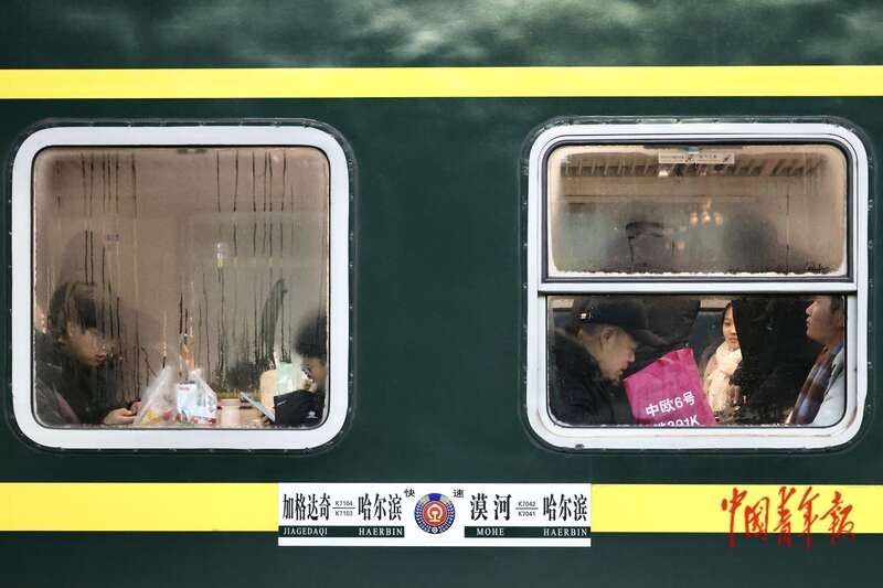 1月19日,黑龙江哈尔滨站,K7041次列车车窗玻璃布满冷凝水。当日,哈尔滨的气温已低于零下20摄氏度,漠河的气温则更低。中青报·中青网记者 杨雷/摄