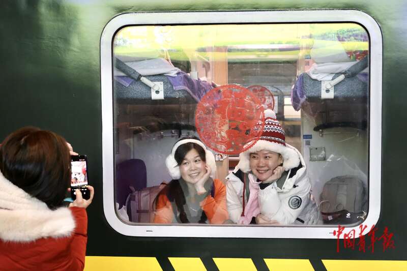 1月19日,黑龙江哈尔滨站,两位旅客以大红福字窗花为背景合影,脸上露出笑容。中青报·中青网记者 杨雷/摄