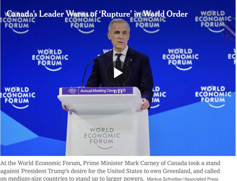 “加拿大人知道,我们过去那种认为我们的地理位置和同盟关系能自动带来繁荣、安全的安逸想法,已不再成立。”当地时间1月20日,加拿大总理马克·卡尼在瑞士达沃斯发表了一场演讲,坦率地阐述了他对世界的看法。