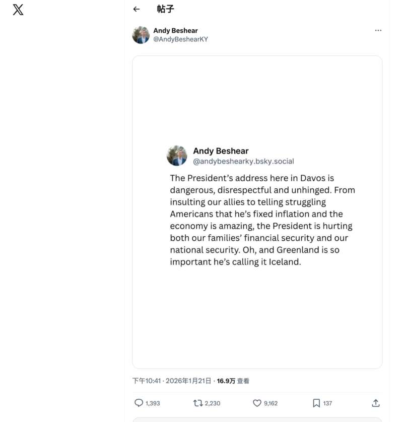 有分析人士告诉美国《华盛顿邮报》,特朗普对格陵兰岛的计划威胁着北约和跨大西洋联盟的根基。美国肯塔基州州长安迪·贝希尔在社交平台“X”上警告称,特朗普21日的演讲“危险、不尊重且失控”,“总统的言行正持续损害美国民众的家庭财务安全与国家整体安全。”