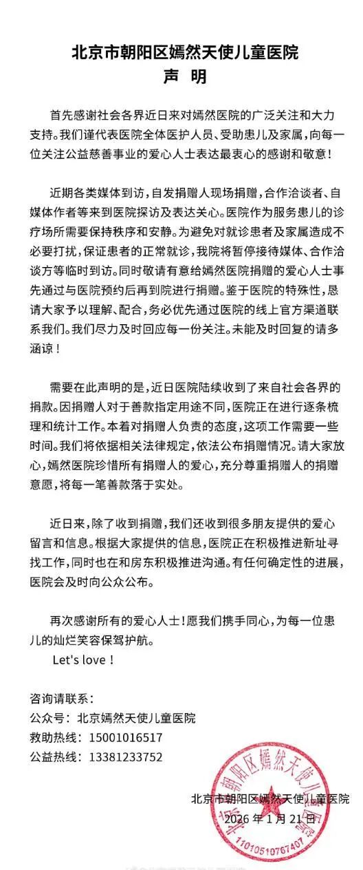 1月21日傍晚,嫣然天使儿童医院官方微博发文表示,近日医院陆续收到了来自社会各界的捐款。因捐赠人对于善款指定用途不同,医院正在进行逐条梳理和统计工作。本着对捐赠人负责的态度,这项工作需要一些时间。除了收到捐赠,我们还收到很多朋友提供的爱心留言和信息。根据大家提供的信息,医院正在积极推进新址寻找工作,同时也在和房东积极推进沟通。有任何确定性的进展,医院会及时向公众公布。