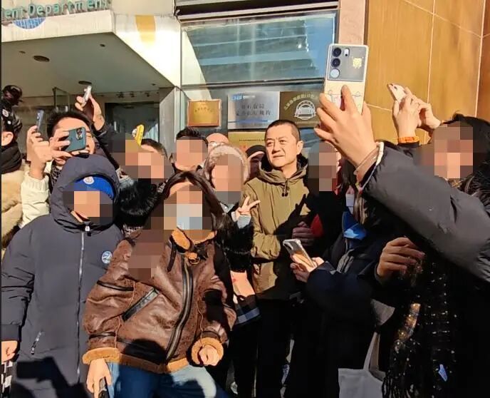 目送陈光标离开后,李亚鹏转身返回医院,身后很多人举着手机拍摄。可能因为天气寒冷,他拽了拽帽子。在即将走进医院大门的时候,看到有小孩想要合影,李亚鹏顺势把孩子搂在身边配合拍照,随后又与现场很多人合影。