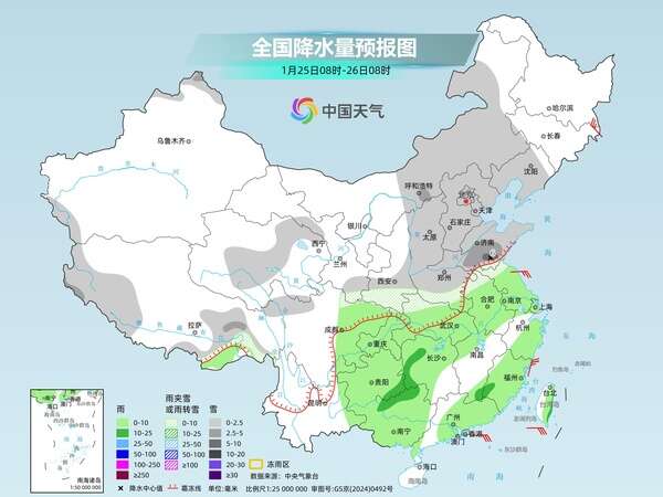 今明两天,华南多地也将放晴,全国大部的降水将进一步缩减。同时,新疆西部、西藏西部的降雪将持续,局地或现大暴雪。25日起,新一股冷空气将影响我国,西北地区东南部、华北、东北地区、黄淮等地将迎来降雪。