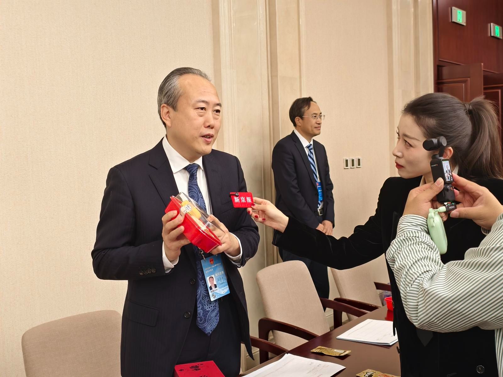 现场,北京市商务局局长朴学东向记者展示了老字号北京稻香村的糕点。在“开摊儿”前,该局筛选了具有新春特色的北京老字号产品,带到现场邀请代表委员品尝交流。
