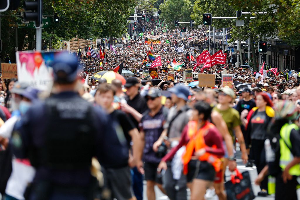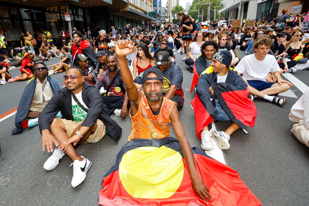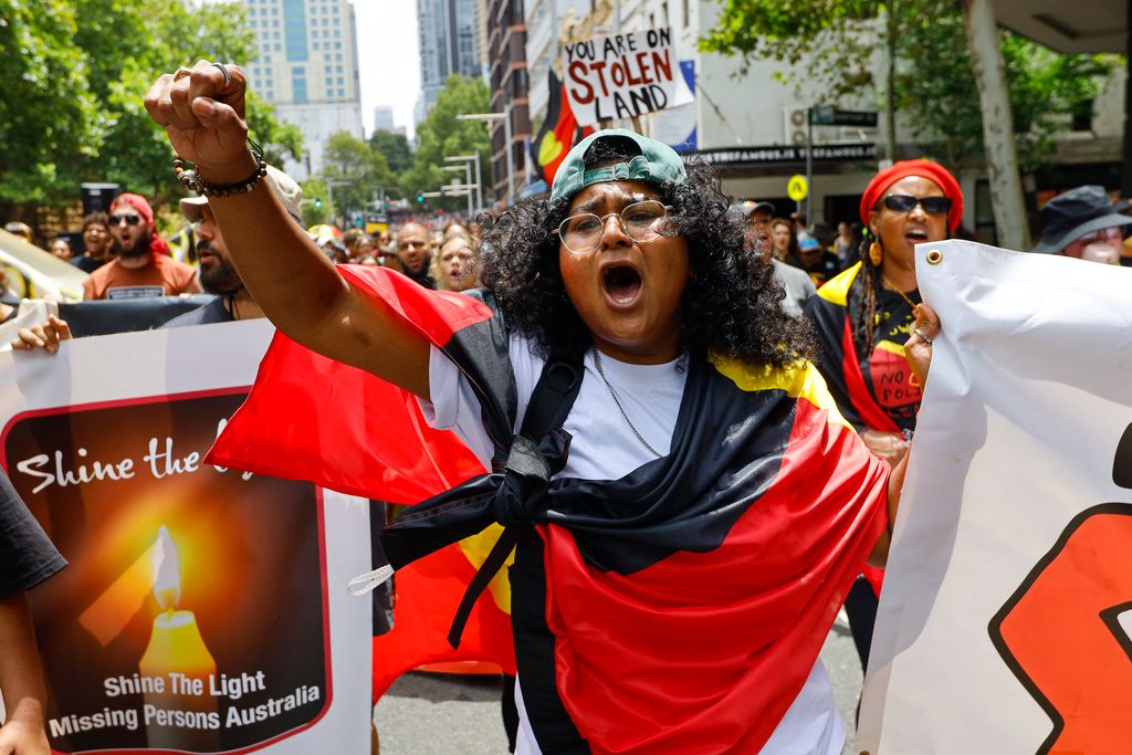 当地时间2026年1月26日,澳大利亚新南威尔士州悉尼,在“入侵日”抗议活动中,示威者穿过中央商务区。澳大利亚原住民及其支持者聚集在悉尼,参加一年一度的“入侵日”抗议活动,纪念1788年1月26日亚瑟·菲利普在悉尼湾升起英国国旗。原住民社区将这一天视为“入侵日”或“生存日”,这一日期象征着殖民的开始及其对原住民和托雷斯海峡岛民的持久影响。与此同时,该市还举行了另一场集会,极右翼团体举行了反移民游行。