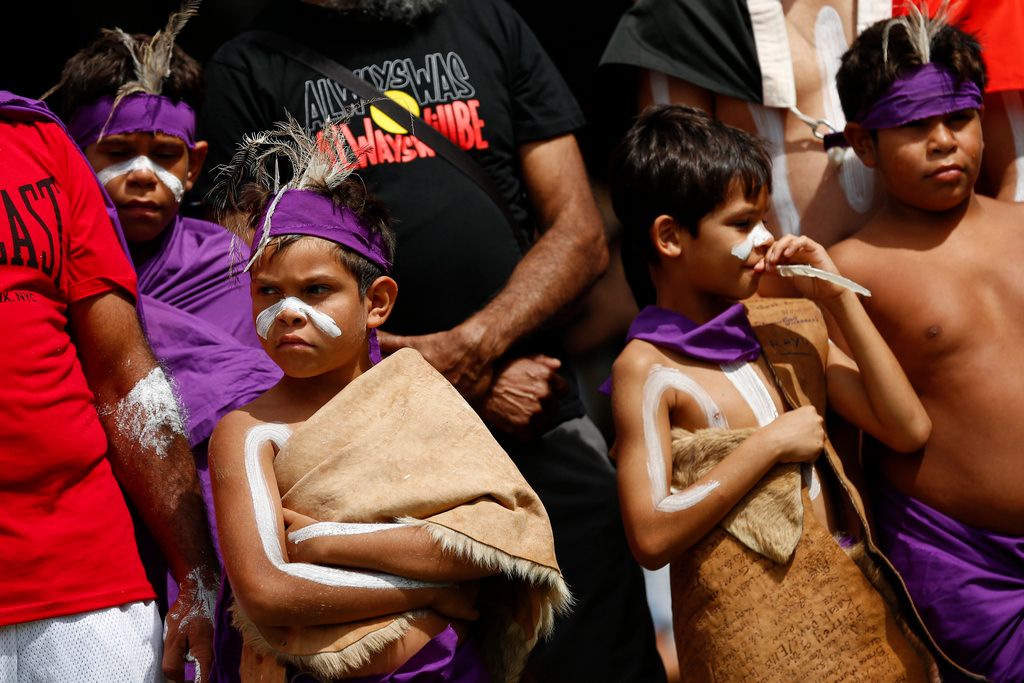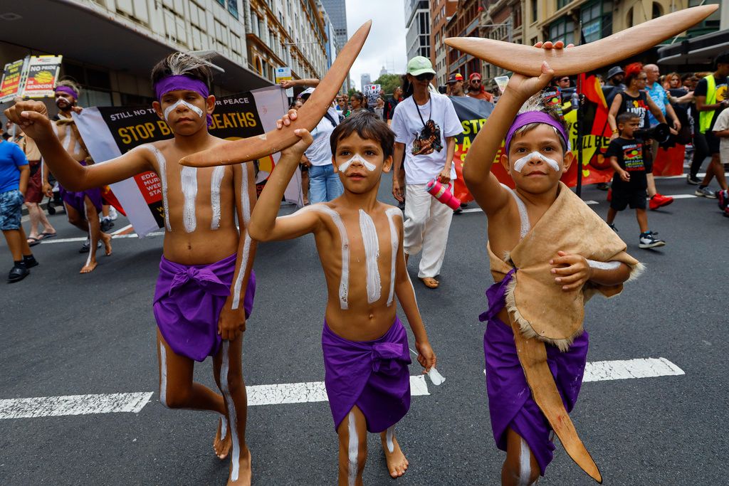 当地时间2026年1月26日,澳大利亚新南威尔士州悉尼,原住民男孩们手持回旋镖,在“入侵日”集会上做出反应。澳大利亚原住民及其支持者在悉尼举行一年一度的“入侵日”抗议活动,纪念1788年1月26日亚瑟·菲利普在悉尼湾升起英国国旗。这一天被原住民社区视为“入侵日”或“生存日”,象征着殖民的开始及其对原住民和托雷斯海峡岛民的持久影响。