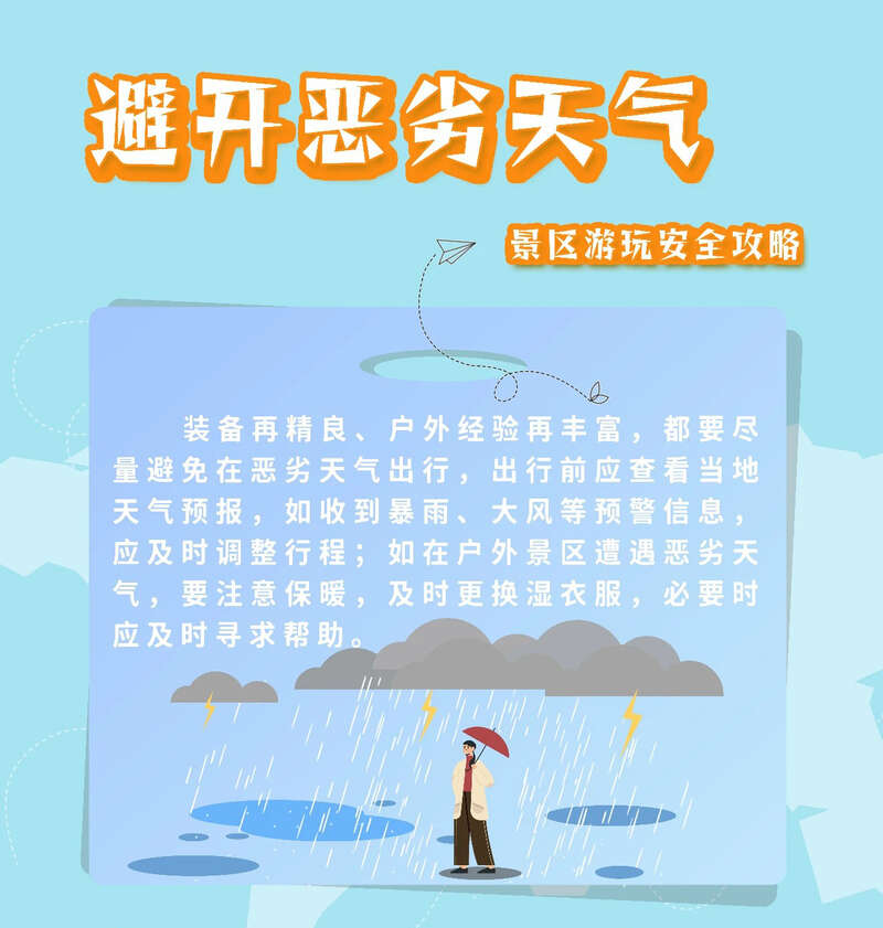 1.提前了解目的地的天气状况,若天气不稳定,则避免出行。