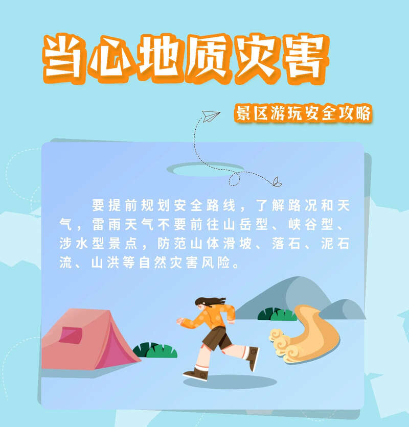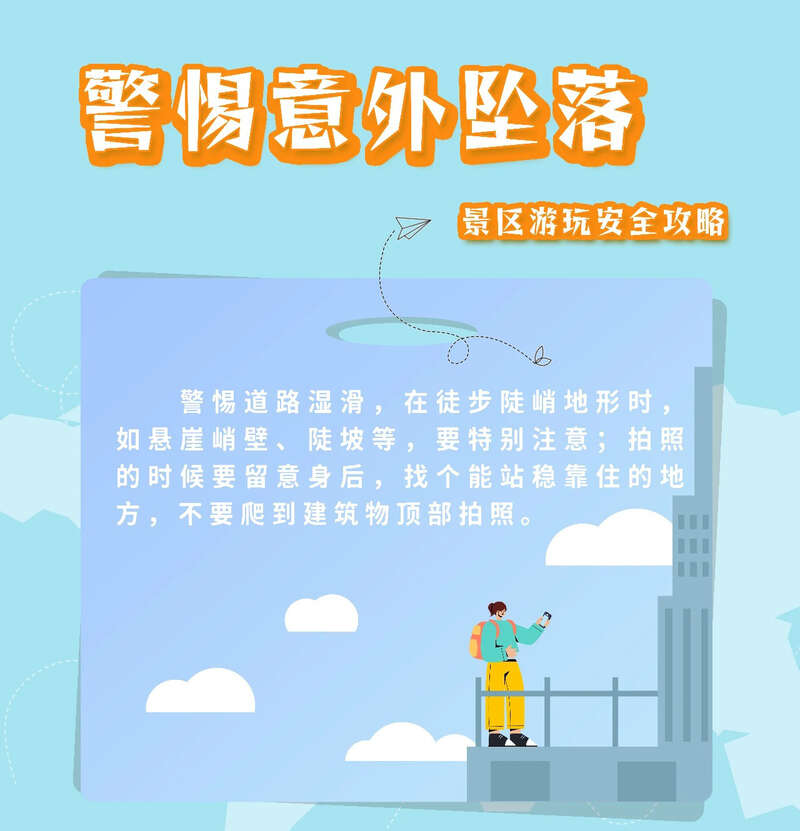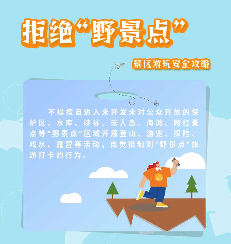 开展徒步、登山等户外旅游活动前务必提前规划合理路线,关注景区官方安全提示、天气预警信息,配备必要的安全防护装备,增强自我保护意识和应急避险能力。