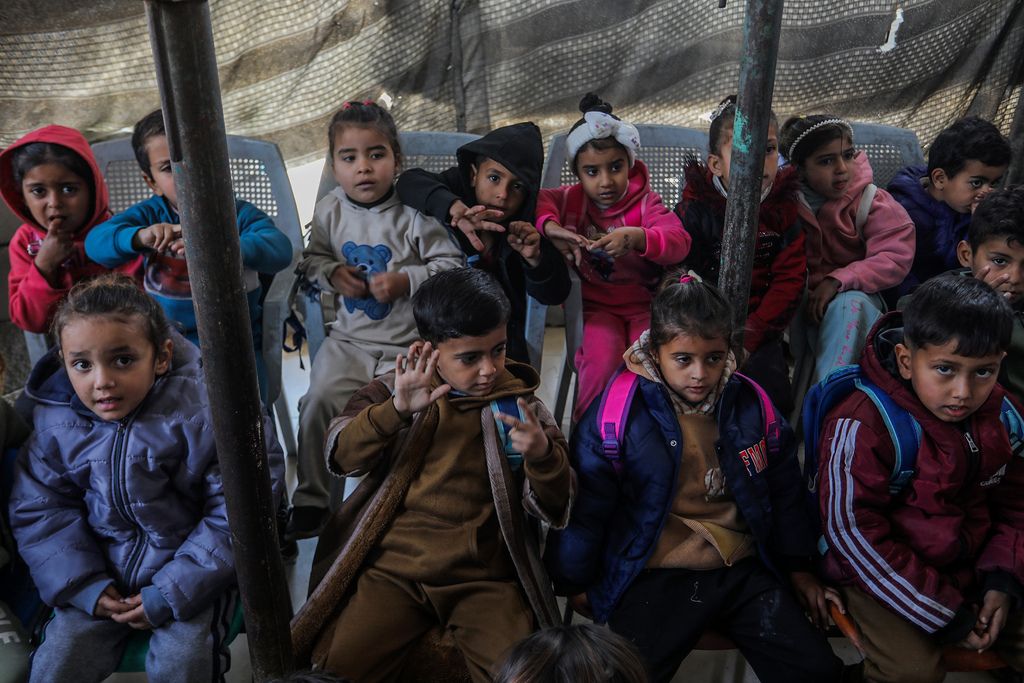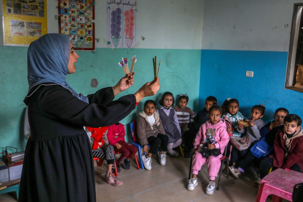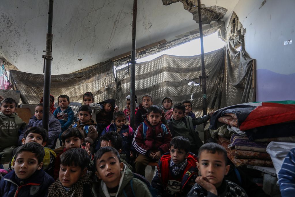 当地时间2026年1月28日,加沙地带汗尤尼斯,在以色列袭击中流离失所的巴勒斯坦儿童在部分受损的幼儿园继续学习。尽管教育设施遭到严重破坏,但由于志愿者的介入,幼儿园仍在运营,以防止学业完全中断。志愿者教师在被毁的教室里用极其有限的资源授课,确保年轻学生在当地持续的困境和流离失所中保持学习。
