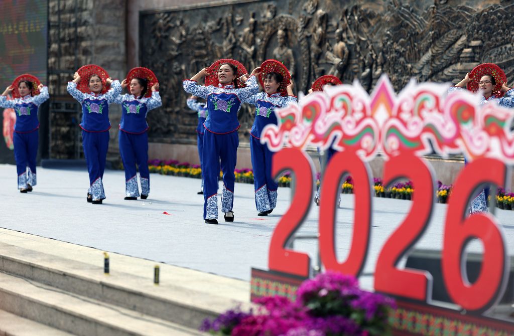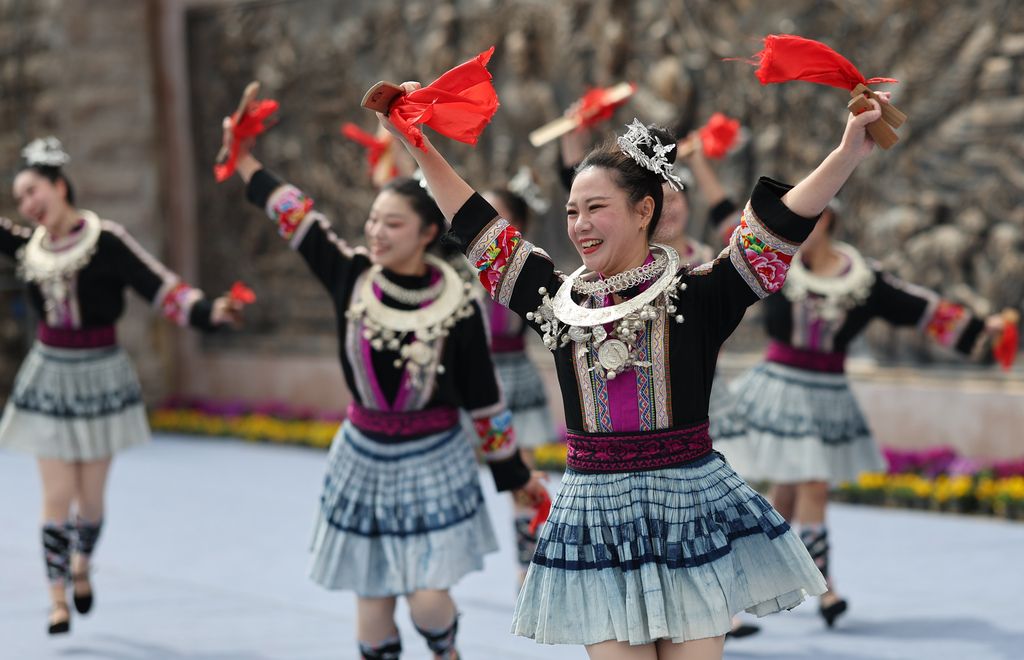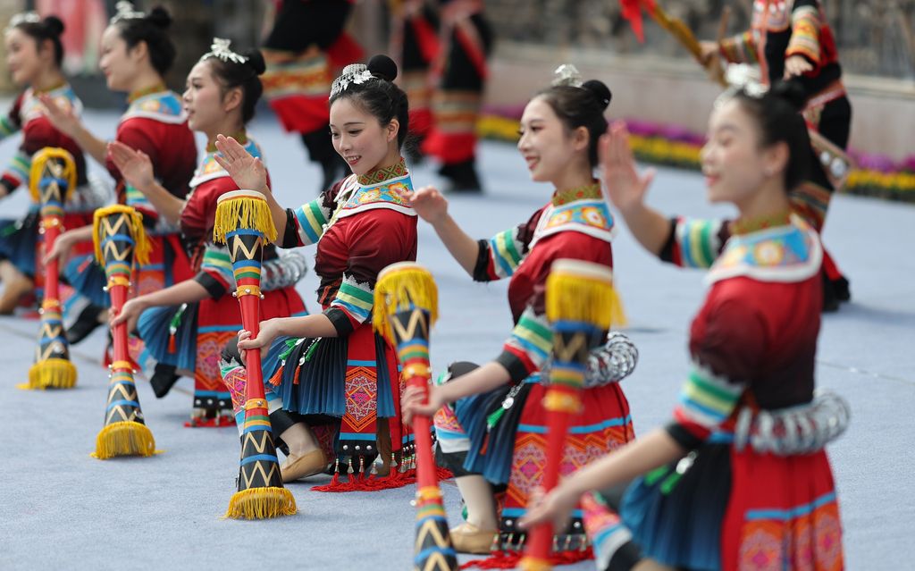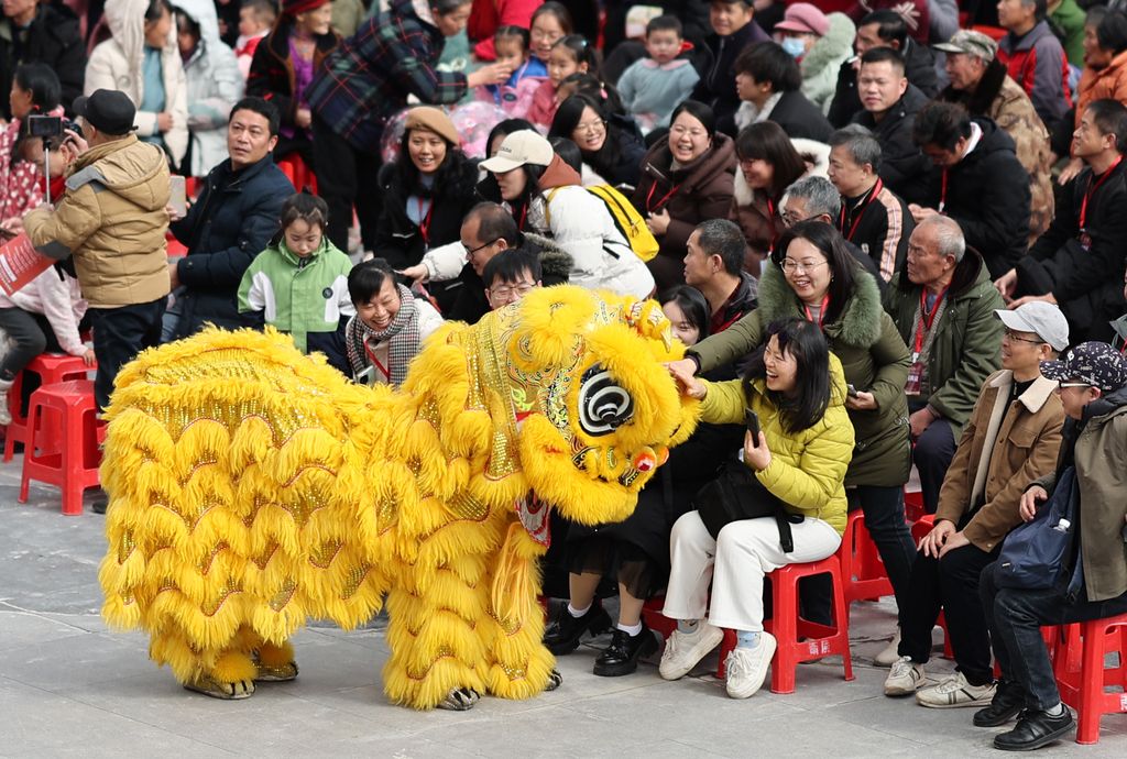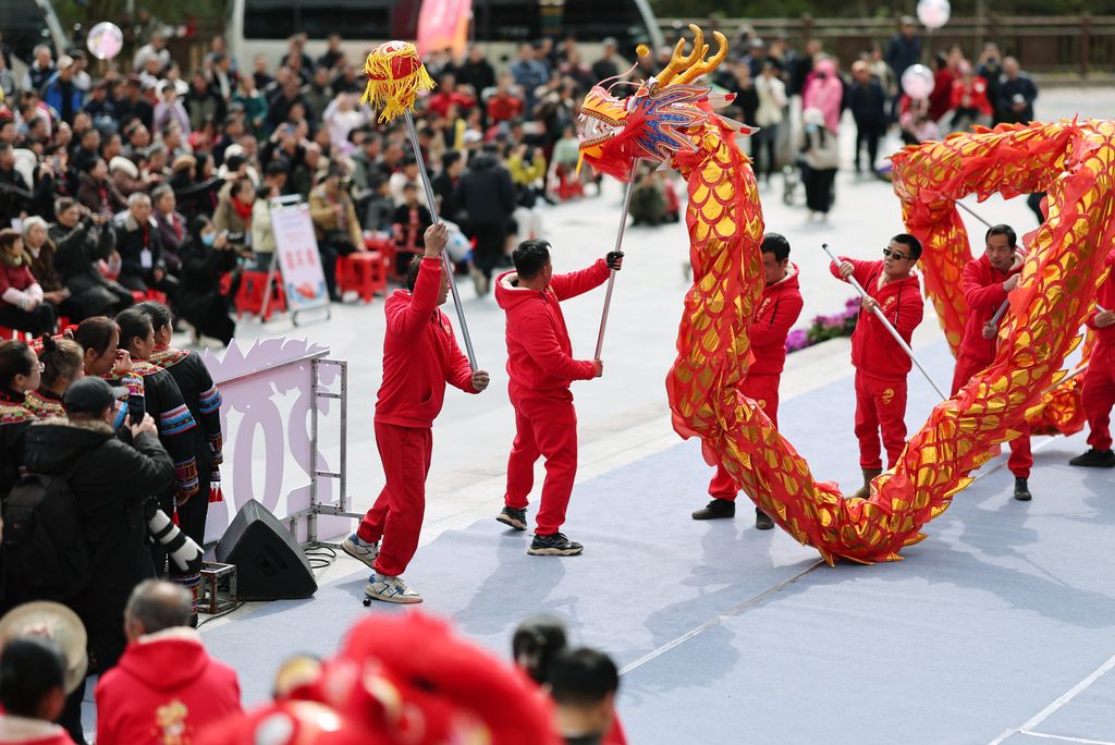 2026年1月31日,广西桂林,灵川县兰田瑶族乡开展群众性文艺汇演,当地各族群众身着盛装,开展舞龙舞狮、走牌灯、唱山歌等系列民俗活动,载歌载舞欢庆瑶乡成立四十周年,喜迎即将到来的马年新春。