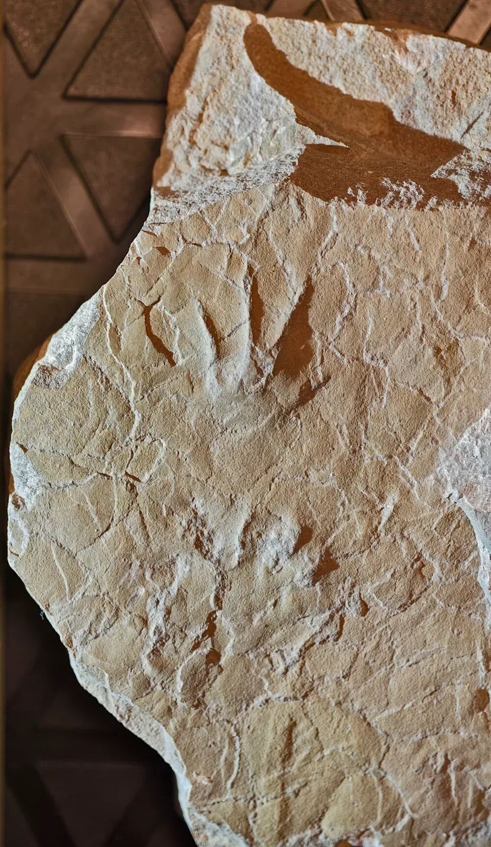 另一枚印痕则保存较差,被解释为同一只动物的左后足迹,与前足迹相距约6.7毫米。这枚足印显示出五趾的迹象,但印记宽短且模糊。其中,第四趾的印痕相对最长,第二趾次之,第三趾再次之。足印整体长度约1.1厘米,宽度约1.4厘米。其后部有一个宽大的足底(跖部)印痕区域。