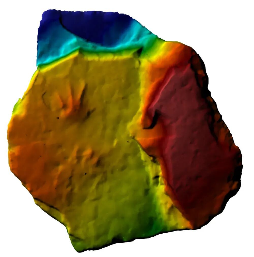 为了从这些微小印痕中提取最大限度的信息,研究团队采用摄影测量三维建模技术,生成高精度的三维数字模型,从而能够从任意视角观察,并制作出等高线图、假色高程图等,以可视化方式揭示印痕表面最细微的起伏特征,为形态分析提供坚实的数据基础。