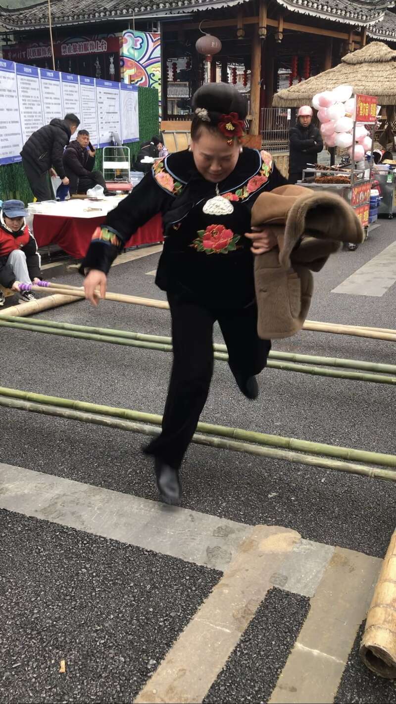 在他身旁,穿着鲜红色民族服装的人们在跳竹竿舞,穿着红马甲的青年志愿者按照节奏,竹竿打开、合并,跳舞的人如果跟不上节奏就会夹到脚。