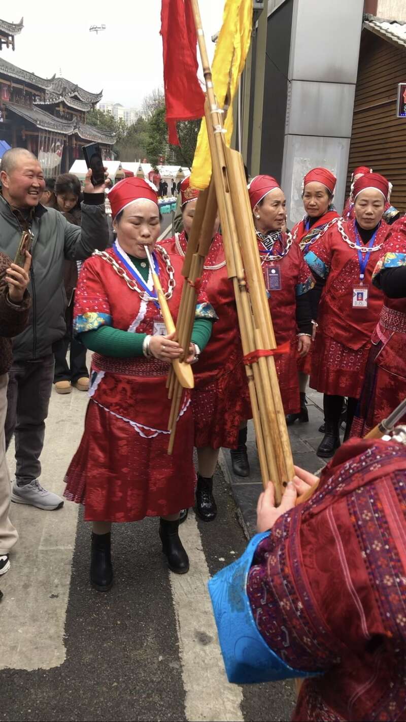 在人群中,记者偶遇了正在直播的谢宗旭。这名土生土长的贵州青年是清华大学博士生,因身穿苗族传统服饰在联合国气候变化大会上发言而走红网络。今年1月,他还被聘为凯里苗侗风情园的名誉园长。