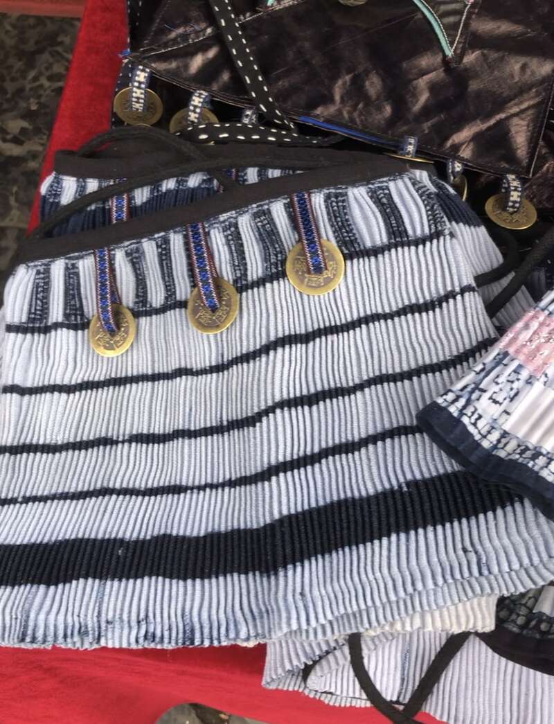 “绣里淘”的一天从上午10点多钟开始,摊主陆续开始出摊。摊位上摆着从村里收来的老绣片,还有用刺绣工艺做的各种小玩意儿,这些绣品有各种风格,有的绣着抽象的人物、动物,有的是严谨的几何图案。刺绣、蜡染等传统工艺,与各种各样的物品结合,除了发卡、挂饰、钥匙扣、玩偶等,还有以苗族百褶裙为灵感做的手提包,令人目不暇接。