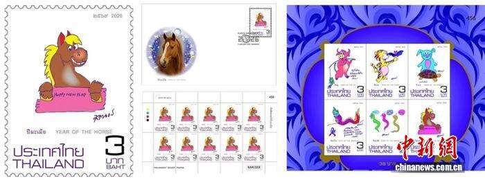 中国邮政于2026年1月5日发行《丙午年》特种邮票,一套2枚,由王红卫、赵恩重设计,分别为红马奔腾于祥云之上的“驰跃宏图”,以及三匹骏马奔腾,背景饰以红色调吉祥纹样的“万骏臻福”。