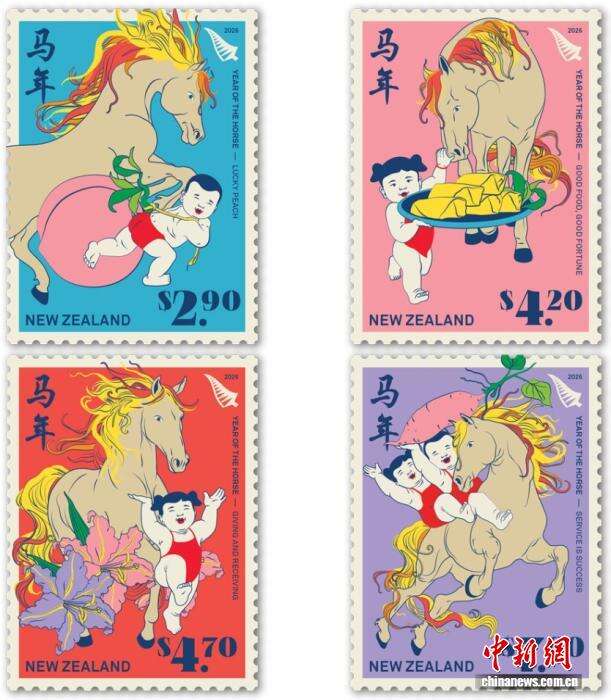 新西兰的“马票”也与本地元素深度融合。据集邮博览消息,新西兰邮政发行一套四枚农历生肖马年邮票,采用中国年画风格,主题分别为象征长寿的幸运桃、春节特色食品——春卷、纪念华人矿工贡献的百合花,以及象征新西兰本土蔬菜种植业的新西兰红薯。