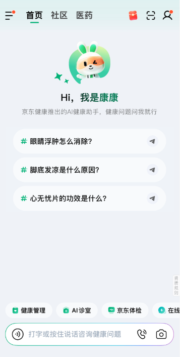 当前市场上各公司的AI问诊产品,功能大同小异,主要可以分为“给普通病人用的”和“给医生用的”两大板块。以京东健康的产品为例:第一类是健康AI专业角色,即AI健康助手,如AI医生、AI营养师等,适配线上场景的疾病症状咨询、健康管理、药品使用、健康商品导购等场景。