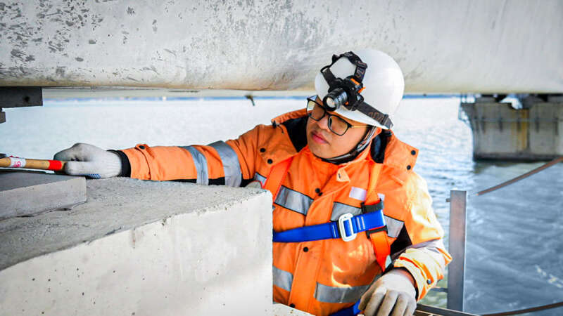 桥体间的缝隙狭窄,进入大桥内部后更是伸手不见五指。上海高铁基础设施段湖州车间桥梁组工作人员借着头灯的光线,像啄木鸟为树木问诊一般,沿梁体一路进行听诊式的检查。