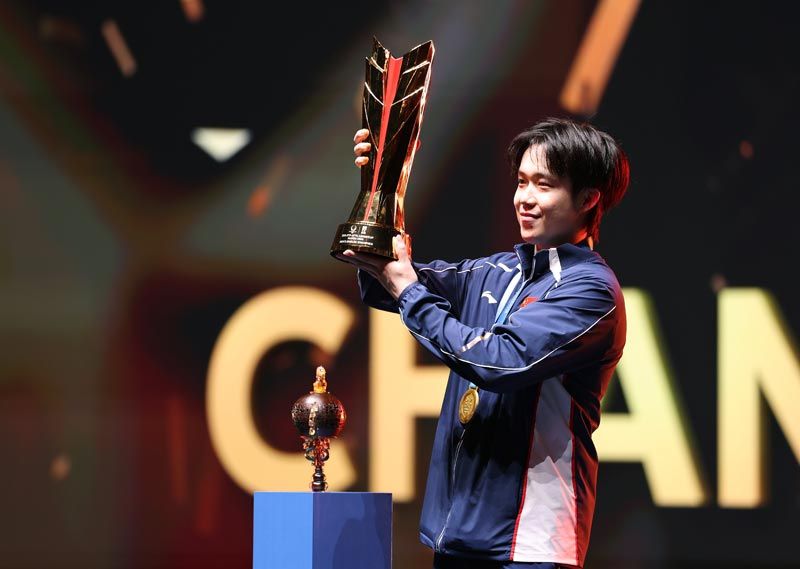 王楚钦高举男子单打奖杯庆祝夺冠。刘占崑/摄
