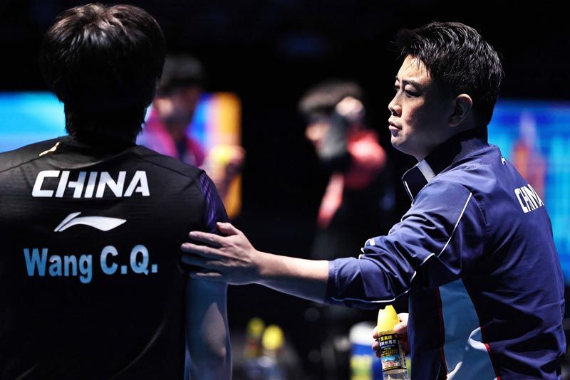 王皓教练(右)鼓励王楚钦放开打。刘占崑/摄