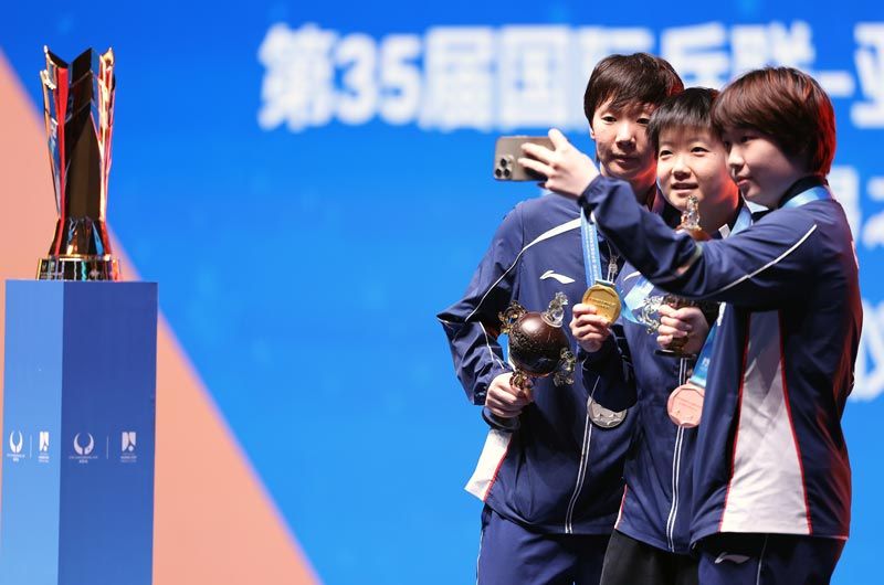 获得女子单打冠军的孙颖莎(中)与亚军王曼昱(左)、季军蒯曼共同合影留念。刘占崑/摄