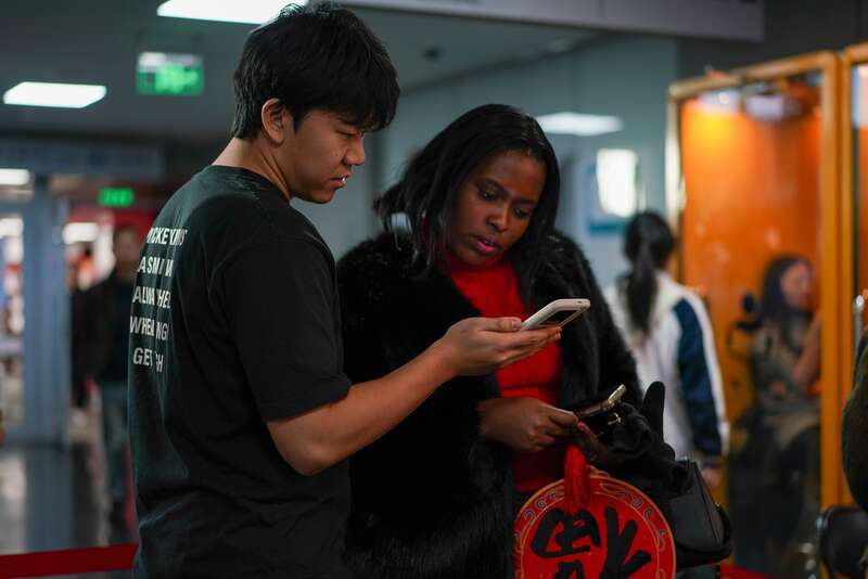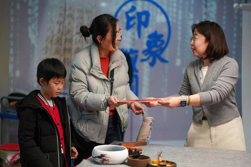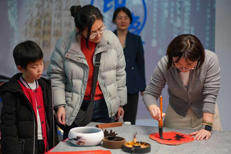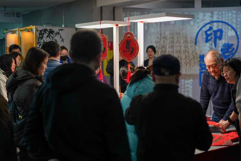 国家图书馆总馆北区二层大厅设置了“福”字和“马”字的翻牌互动区,读者可以观摩不同字体写法。中青在线见习记者 胡庆章/摄