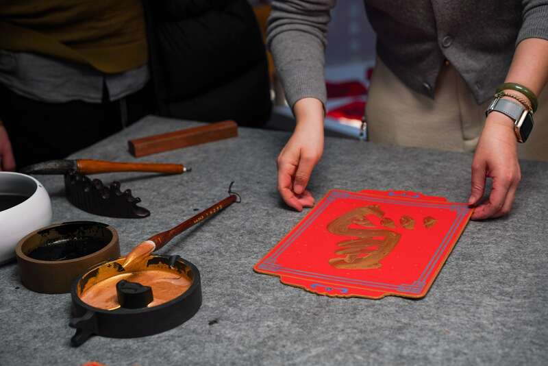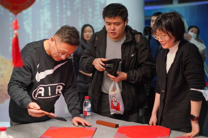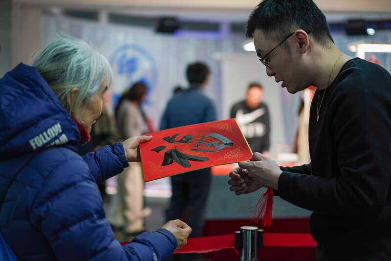 工作人员为读者书写“福”字。中青在线见习记者 胡庆章/摄