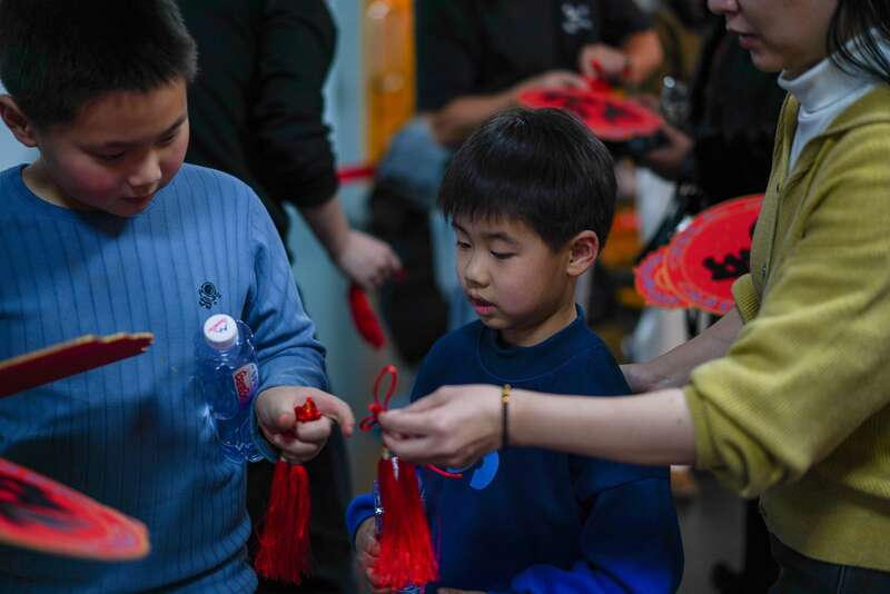 工作人员赠送流苏,读者用流苏装饰“福”字。中青在线见习记者 胡庆章/摄