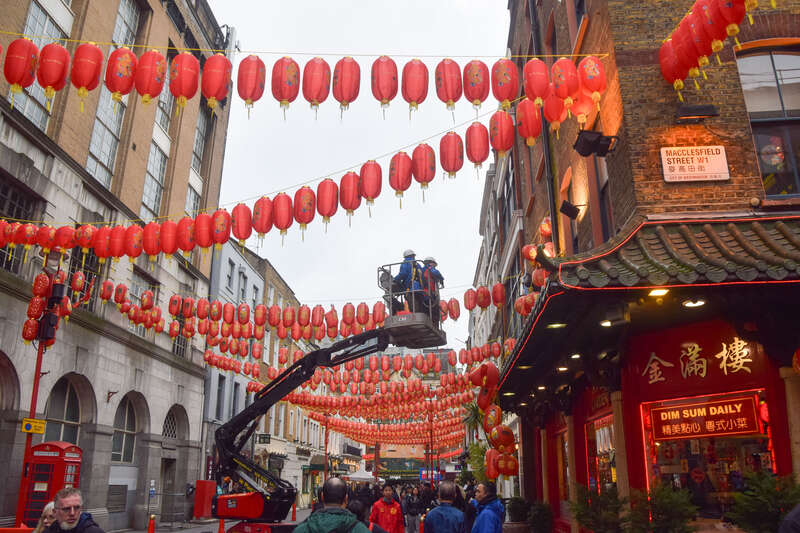 当地时间2月9日,英国伦敦,工人在中国农历新年前夕在唐人街装饰红色灯笼。唐人街春节活动不仅有华人社群主导,更有大量英国本地居民、国际游客加入。 视觉中国供图