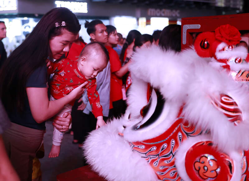 当地时间2月9日,缅甸仰光,当地时代广场装扮一新,新年氛围十足。一名女子抱着孩子在时代广场触摸狮头,迎接中国农历新年。 视觉中国供图