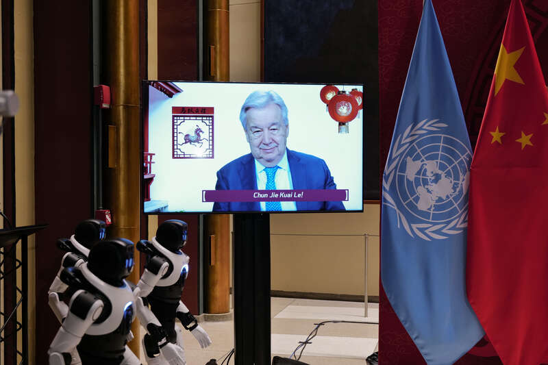 当地时间2月9日,纽约联合国总部,联合国秘书长古特雷斯通过视频发表新春致辞,向中国人民和全球华人致以农历丙午马年的祝福。视觉中国供图
