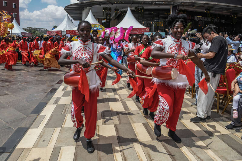 当地时间2月8日,肯尼亚内罗毕,华人居民筹备农历马年春节庆祝活动,当地民众积极参与表演,现场氛围热烈喜庆。 视觉中国供图