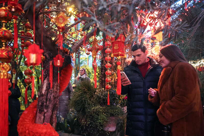 当地时间2月7日,俄罗斯莫斯科,民众在罗蒙诺索夫莫斯科国立大学植物园(药草园)参加中国新年活动。 视觉中国供图