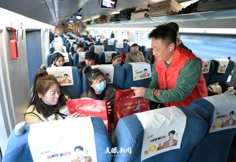 站台上,一个穿红马甲的年轻人跑前跑后,帮着老人搬运行李。他叫游廷韬,来自遵义正安。他既是乘客,也是志愿者。“在网上刷到家乡‘喊游子回家吃饭’的视频,心里一热。”他说。为这份感动,他提前四小时就从温州赶到了金华。他的热心,是奋斗者之间无需言说的默契与互助。