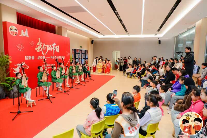 在新春游园会的同时,一场小而精的传统文化节目展演同步举行。寒假期间,活动中心设计了丰富多彩的、以传承中华优秀传统文化为主题的兴趣课程,这些学员正是这场展演的表演者。他们为大家带来了评弹表演、萌娃来拜年、传统文化服饰展示等节目,展现了新时代青少年对传统文化的理解与演绎。