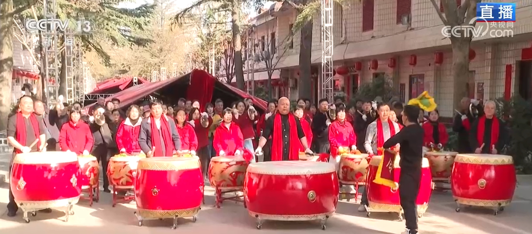 总台记者 张恩雨:此刻,我是在袁家村的村口,同时也是村里百人锣鼓队表演的现场。在陕西关中农村地区,每年过年每个村子都会有这样的锣鼓表演,村民们告诉我,“锣鼓声一响,年就到了。” 大家可以看到,我身后的锣鼓队队员们是激情昂扬、气势如虹。这些铿锵有力的鼓点,正是关中地区非常有名的曲目《秦汉战鼓》,没有繁复的花腔,而是重在力量和气势。 特别值得一提的是,这支队伍里年龄最大的已经75岁,最小的只有26岁,而且所有人都是零基础的村民,仅仅集中学习了10来天,就呈现出了今天这样的气势。