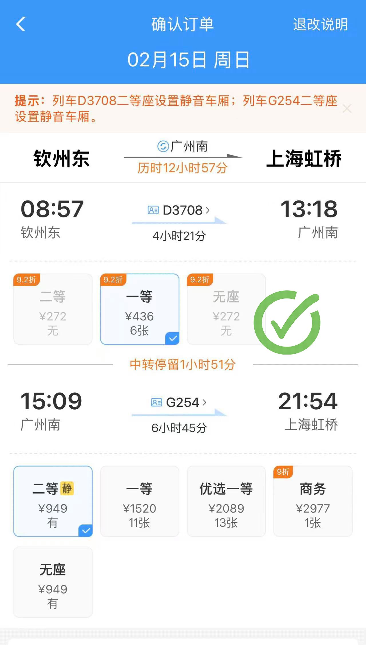 2月20日至21日G4945次南京南至贵阳北二等座打2.7折、全程244元