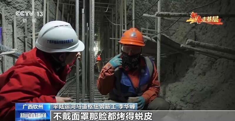 平陆运河马道枢纽钢筋工 李华峰:你看我戴个布面罩,不戴面罩脸都烤得蜕皮,烤狠了容易脸容易烤烂,温度要有几千摄氏度,电焊比气割的温度要高。